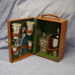 in LEATHER CASE for Cocktails with Combination Lock. Vintage "Mad Men" Era for the train ride! 4 Larger metal cups, 2 smaller cups, Metal cocktail shaker, Glass cocktail shaker with figures, Golf handled 2 size measurer, strainer, olive fork & spoon, 3 Amtrack swizzle sticks & 1 from a motel. This is how I bought it, some pieces original to it & some were added. Case measures 12.50" plus handle x 9" x 6 " . V. Good condition, some wear to metal pieces