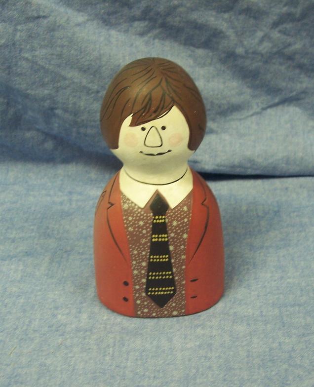 Great Mod Hippie Era Bank of either John (without glasses) or Paul. Great Carnaby Street Mod shirt and wide tie. Made of a Papier Mache type Material and looks to be Japan made. 3 3/4" high x 2 1/2" across x 2 1/2" deep. V. Good Condition, a couple of pin point paint loss, fade on one shoulder. Has Rubber stopper on bottom and "Go Go" Label