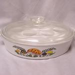 1) Pyrex Verde Green 2 1/2 Qt Casserole, oval with fruit design on opal lid. VG